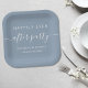 Chic dusty blue paper plates for your wedding reception and other post-wedding celebrations that feature "Happily Ever After Party" in simple modern white typography and an elegant white script with swashes, your first names joined by a heart and your reception date.
