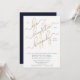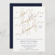 This beautiful, modern Navy Blue White and Gold Script Engagement Party Invitation features a faux gold leaf calligraphy script reading 'To Love, Laughter, and Happily Ever After" as the main design element. The design is beautifully complemented by the modern all cap sans serif font in navy blue, on the crisp, white background, detailing the time, date and location. The back of the invite is navy blue, to complete the chic, sophisticated look. Copyright Anastasia Designs, all rights reserved.