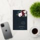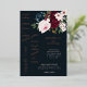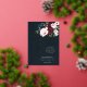 Bold, elegant, and romantic wedding invitation featuring our painted elegant watercolor flowers. Beautiful bold floral arrangements with deep burgundy, rich navy blue, and blush pink flowers with accents of lush green sage leaves and greenery. Florals are arranged in beautiful bouquet arrangements to create this bold and elegant floral design. “Happily Ever After Party” is displayed in an elegant typography design with the wedding invitation details beautifully arranged. Watercolor florals painted by Moodthology.