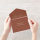 Elegant terracotta casual wedding reception all-in-one invitation featuring "Happily Ever After Party" showcased in simple lettering and a chic script with swashes, your marriage announcement and reception details, and a white tear-away RSVP postcard, all rendered in your choice of genuine gold, silver or rose gold foil.