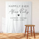 Chic white wedding reception welcome and photo backdrop tapestry featuring "Happily Ever After Party" in simple typography and a stylish modern script, a heart and your names and reception date.