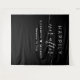 Simple black wedding reception or party photo backdrop tapestry with "Happily Ever After" in a mix of simple white typography and a trendy white script with swashes, your first names and the event date.