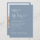 Minimalist dusty blue wedding reception invitation featuring "Happily Ever After Party" in a chic white script, your invitation in classic white serif typography, and your names in a signature-like script. On the back, upload your photo and input your wedding website address to create a QR code that your guests can scan to RSVP online and obtain additional details.
