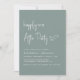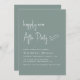 Minimalist sage green wedding reception invitation featuring "Happily Ever After Party" in a chic white script, your details in modern white lettering, and your names in classic white serif typography.