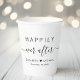 Chic paper cups for your wedding reception, engagement parties, rehearsal dinner, couples showers and other wedding celebrations that feature "Happily Ever After" in simple modern typography and a stylish script with swashes, your first names joined by a heart and your wedding date.
