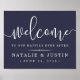 Welcome guests to your wedding with our sweetly chic poster, available in several sizes. Design features white typography on your choice of background colours with "welcome" at the top in elegant handwritten calligraphy script, and "...to our happily ever after" and your names and wedding date beneath. Shown in rich midnight navy blue.