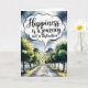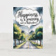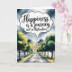 Share a meaningful message about enjoying the present with this beautiful watercolor art card. The illustration depicts a peaceful scene of a winding road lined with green trees, leading toward distant mountains under a dramatic sky. The quote, "Happiness is a journey, not a destination," is featured prominently in elegant script within a cloud speech bubble. This card is perfect for travel lovers, a retirement gift, new beginnings, or sending a general message of inspirational encouragement to appreciate life's process. The artistic landscape painting style gives it a unique and sophisticated feel.