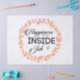 Happiness is an inside job graphic with a peach pink wreath and heart. Happiness, love and inner peace is always from within. Custom graphic design made with love.