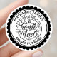 Happiness Is Homemade Vintage Personalised Label Sticker. This custom design features a round scallop frame with the typography quote "Happiness is Homemade". Personalise this custom design with your own name. Perfect label for homemade food, gifts, or beauty products.