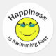 A big yellow face with goggles declares that Happiness is Swimming Fast. Great gift for swim team members or a swim coach
