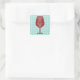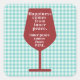 Fun square sticker design for wine lovers features red wine glass with funny quote that reads "Happiness comes from inner peace. Inner peace comes from wine" on blue and white gingham background.