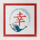 Colourful illustration features 'Happiness" Japanese calligraphy centre with blue crane wreath, white background and red border.