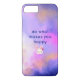 A phone case with an inspirational quote which says "do what makes you happy". Illustrated with a cute kawaii bunny face holding a heart. The background is an abstract watercolor painting with luminous space clouds in soft pastel colours.