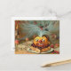 Happy Jack-o-Lantern sits on top of a cake. Witches and devils fly overhead. Vintage cartoon design.