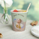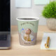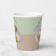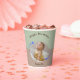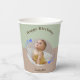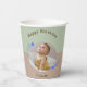 Happy Birthday paper cup celebrating Our Shooting Star's First Birthday. The paper cup features a circular photo of your child surrounded by whimsical blue shooting stars on a green and brown background. Happy Birthday cups are gender neutral and is adorned with script calligraphy. It is a minimalistic and modern cup and the stars add to the a simple yet magical touch. Customise with your own details.
