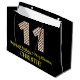 This simple and fun Christmas-themed and birthday-themed December 25th birthday gift bag design features a large number "11", with a red, white, and green stripes pattern. It also features the message "Happy 11th Birthday & Merry Christmas,", and a personalised name. The background is coloured black. A gift bag like this might be used when wrapping presents that are being given to somebody who was born on December 25th (Christmas Day) and who is celebrating their eleventh birthday. [~Z0000407]