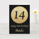 Happy 14th Birthday Black and Gold Glitter Card with personalized name. For further customization, please click the "Customize it" button and use our design tool to modify this template.