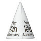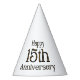 These party hats feature the words "Happy 15th Anniversary" in a unique print font with gold letters black outline. All paper hats have an attached elastic string printed in full vibrant colours made in the USA has a Minimum of 12 order requirement.