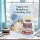 This hand-painted watercolor and pen illustration features a cheerful groundhog peeking out of his den to celebrate a special 25th birthday, reaching for a chocolate and vanilla cake topped with strawberries, blueberries, and boysenberries. A charming Groundhog Day birthday design that adds seasonal fun to an age-specific celebration.