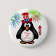 HAPPY 4TH OF JULY Penguin Fireworks Pin Button . Here's Paddy Penguin again, this time celebrating the summer holiday. He's got his red white and blue, stars and stripes, top hat and his red rocket. Up in the sky, fireworks are bursting, in red, blue and green and yellow. How can you resist this cute patriotic penguin with the round chubby belly and big eyes. Wording can be changed if fits, or deleted to leave plain. Available in different sizes but image fits best on round ones.