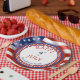 Paper plate featuring a design inspired by barbecue and the American flag. Nice for 4th of July celebrations or other festivities with a patriotic theme.