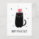 Happy fourth of July card featuring a black cat wearing a patriotic hat with stars and stripes. The cat is surrounded by blue stars. Text: happy 4th of July!