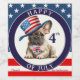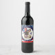 A cute wine label featuring a bulldog or pug with American hat to celebrate 4th of July. The background is the USA flag.