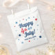 Stylish patriotic Fourth of July holiday custom favour bag design features an "Happy 4th of July" quote script typography text design in red, white, blue, and navy blue colours with star accents. Personalise the navy blue text with your family's name or other preferred wording.