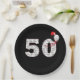 50th birthday party with bold black and white happy 50 text on black with party balloon bouquet.
