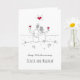 Middle aged Wife and Husband are sitting on the sea shore holding glasses of wine in their hands. They are watching the sunset, and the sun takes the shape of a shining heart for this happy moment of their 50th wedding anniversary. Design of the card is made in very simple pen and ink cartoony technique with the three red spots: heart and two wine glasses. Great Card for the Golden Wedding Anniversary! You can easily personnalise the text (greeting and names) at the lower part of the card using Zazzle personalization tools.