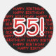 Black, red, and white Happy 55th Birthday design on 55th birthday T-shirts, cards, mugs, buttons, and other 55th birthday items.