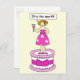 A cartoon lady standing on a giant pink and white cake, holding a cocktail and saying '59 is the new 49'.