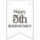 This bunting banner feature the words "Happy 5th Anniversary" in a unique print font with gold letters black outline. All banners have single sided printing outdoor safe made with sturdy plastic polystyrene and thick plastic rope has (16) 5.5" x 8" swallowtail flags on a 6' long string.