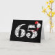 Bold black and white happy text and number 65 text on black with a party balloon bouquet.