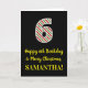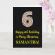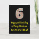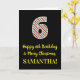 The front of this fun and simple Christmas-themed and birthday-themed December 25th birthday greeting card design features a large number "6" with a red/white/green stripes pattern, along with the message "Happy 6th Birthday & Merry Christmas,", and a custom name. The background of the front is colored black. The inside features a personalized birthday greeting message, or could perhaps be cleared and left blank if a message is to be written by hand instead. A customizable birthday card like this might be a fun way to send a message in celebration of somebody’s sixth birthday that also falls on December 25th (Christmas Day). [~Z0000405]