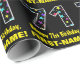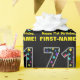 This fun birthday themed wrapping paper design features a large number "71", filled with a pattern of decorative star shapes having various sizes and colours. It also features the message "Happy 71st Birthday,", and a personalised name. The background is coloured black. Fun wrapping paper like this might be used when wrapping presents being given to somebody in celebration of their seventy first birthday. [~Z0000429]
