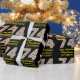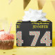 This simple and fun Christmas-themed and birthday-themed December 25th birthday wrapping paper design features a large number "74" with a green, white, and red stripes pattern, along with the message "Happy 74th Birthday & Merry Christmas,", and a customisable name. The background is coloured black. Wrapping paper like this might be a fun way of wrapping gifts that are being given to somebody who was born on December 25th (Christmas Day) and who is celebrating their seventy fourth birthday. [~Z0000406]