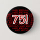 Black, red, and white Happy 75th Birthday design on 75th birthday T-shirts, cards, mugs, buttons, and other 75th birthday items.