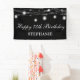 This 75th happy birthday banner features lights and hanging mason jars on a black background. Personalise it with a name.