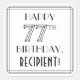 This elegant 1920s/1930s era inspired art deco look birthday square sticker design has the message “HAPPY 77TH BIRTHDAY,”, plus an editable recipient name. The number “77TH” has a fancy geometric lined styling, and there is also a multi-line border around the birthday greeting message. Stylish birthday themed stickers like these might be given out or used at a birthday party celebrating somebody’s seventy-seventh birthday, or perhaps used when wrapping gifts/presents or preparing invitations for such an event. [~Z0000647]