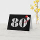 Bold black and white happy text and number 80 text on black with a party balloon bouquet for an 80th birthday.