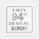 This stylish Roaring Twenties era inspired art deco style birthday-themed paper napkin design features the message “HAPPY 94TH BIRTHDAY,”, and a customisable recipient name. The number “94TH” has a fancy geometric lined styling, and there is also a lined border around the birthday greeting message. Elegant birthday themed paper napkins like these might be used at a party in celebration of somebody’s ninety-fourth birthday. [~Z0000644]