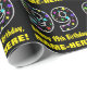 This fun birthday themed wrapping paper design features a large number "99", filled with a pattern of decorative star shapes of various sizes and colours. It also features the message "Happy 99th Birthday,", and an editable name. The background is coloured black. Birthday themed wrapping paper like this might be used when giving a gift or present in celebration of somebody’s ninety ninth birthday. [~Z0000429]