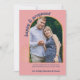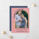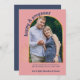 Custom photo pregnancy announcement in gender neutral colour palette of coral pink and navy blue. The photo template is set up for you to add your own photo, which is framed in a gold arch with fine sketched foliage. "happy and pregnant" is lettered in bold, arched typography. The remainder of the wording is all fully editable for you customise with your personalised message, baby due date and your own name(s). A chic, modern design to share a picture of your pregnancy.