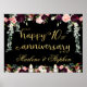 Happy Anniversary poster customisable to any year and names. An extra large 54 by 40 inch poster board with a fancy swashed gold calligraphy font. A bough of deep burgundy and blush pink florals cascade amongst silver greenery garlands and romantic candle lit floral bouquets. The background colour on this poster can be changed to any colour of your choice. Go to Click To Customise Further and select a background colour from the lefthand side panel.