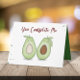 This design features two cute avocados happy anniversary cute funny fun, modern whimsical humour cartoon, for husband wife couple anniversary, a simple minimalist minimal style, from husband wife photo picture, you complete me quote saying, funny anniversary greeting cards, with avocado fruit food comic graphic, husband and wife marriage, artwork by laura lacina