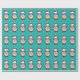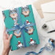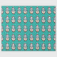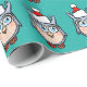 This festive wrapping paper print pattern features a blue-eyed owl with Santa hat and rosy cheeks set on a turquoise background with snowflakes.