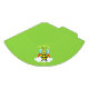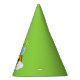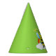 Customisable Happy Bee Day birthday party hats with a waving smiling yellow and black bumble bee with blue eyes and blue wings. He sits on cloud with a multi-coloured rainbow behind him. Customised with your child's name. Back ground colour of hat can be customised. Goes great with our matching paper plates and cups.