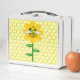 This awesome metal lunchbox features a graphic image of a cute yellow bumblebee with black stripes, eyes, antennae and legs. It has pretty blue and white wings. The bee is sitting on the middle of a golden yellow sunflower. The flower has a green stalk and three leaves. The message "happy bee day" appears spread over the three leaves. The background is composed of a yellow honeycomb pattern.