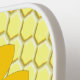 This awesome Pickleball Paddle features a graphic image of a cute yellow bumblebee with black stripes, eyes, antennae and legs. It has pretty blue and white wings. The bee is sitting on the middle of a golden yellow sunflower. The flower has a green stalk and three leaves. The message "happy bee day" appears spread over the three leaves. The background is composed of a yellow honeycomb pattern.